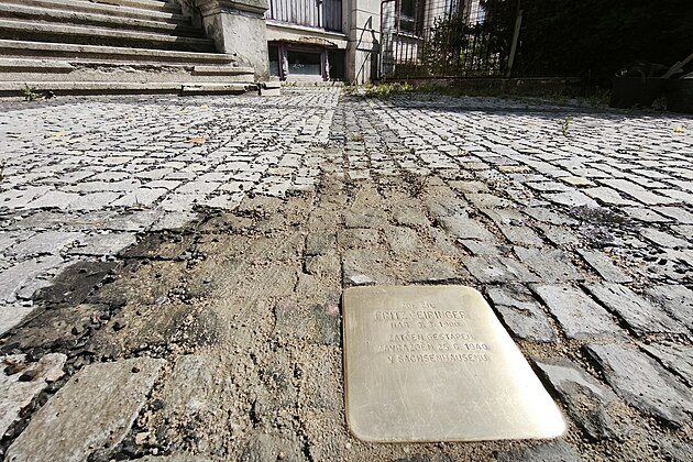 Nový kámen zmizelých, vsazený do chodníku v Mikulášské ulici v Krnově, připomíná Fritze Geiringera.