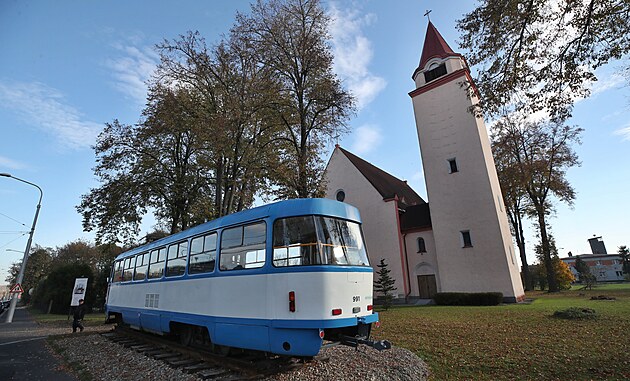 Stará tramvaj T3 nově stojí u kostela sv. Antonína Paduánského v Ostravě-Kunčičkách, postupně z ní vznikne farní kavárna. (25. října 2024)