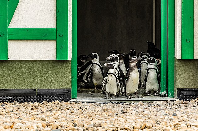 Hejno tučňáků brýlových se v zoo ve Dvoře Králové teprve rozkoukává. (7. července 2022)