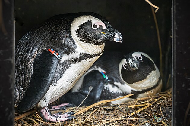 Samci tučňáka brýlového Crosby a Fleury v hnízdní budce