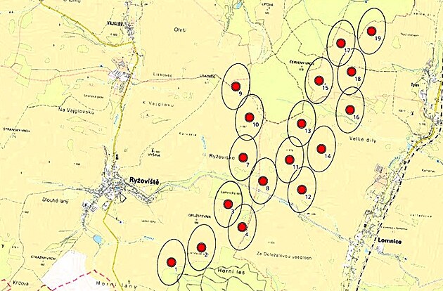 Lomnice – umístění plánovaných turbín v mapě a katastrální mapě