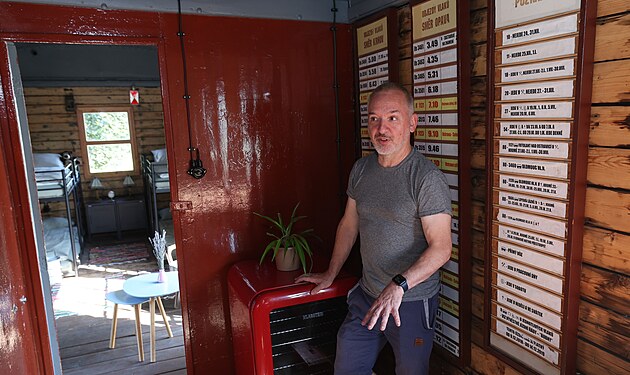 Starosta Úvalna na Krnovsku Radek Šimek v bývalém poštovním vagonu zařízeném pro unikátní ubytování. (28. srpna 2025)