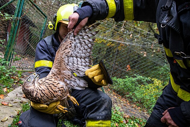 Ostravští hasiči při záchraně jestřába lesního, který se zamotal do ochranné sítě u kurníku. (24. října 2024)