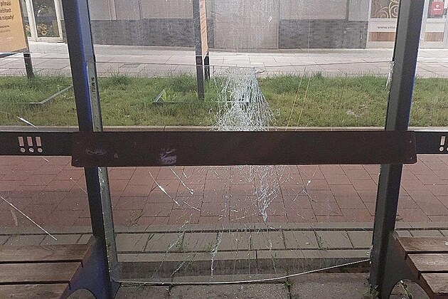 Následky řádění vandala na autobusové zastávce v Ostravě – Zábřehu (17. června 2025)