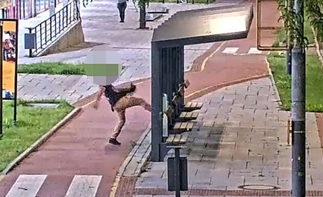 Řádění vandala na autobusové zastávce v Ostravě – Zábřehu zachytila kamera městského dohledového systému. (17. června 2025)