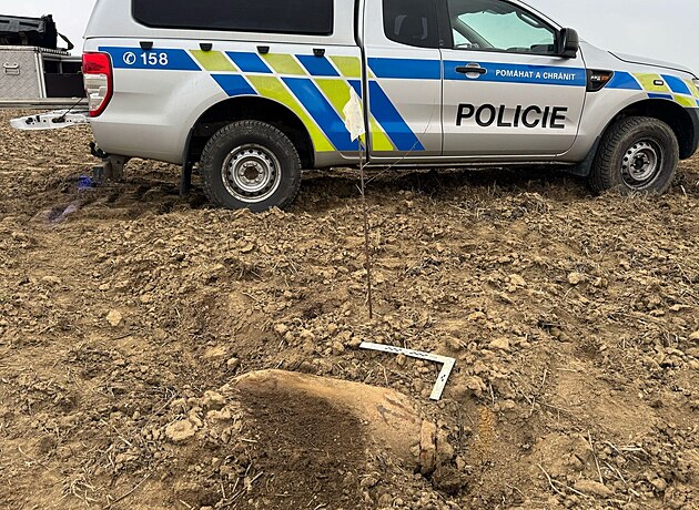 Bombu na okraji Velkých Hoštic na Opavsku objevili při zemědělských pracích na poli (26. března 2025)