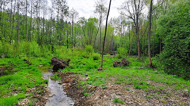 Meandrující koryta Hájnického potoka na Bruntálsku v Moravskoslezském kraji