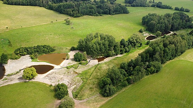 Meandrující koryta Hájnického potoka na Bruntálsku v Moravskoslezském kraji