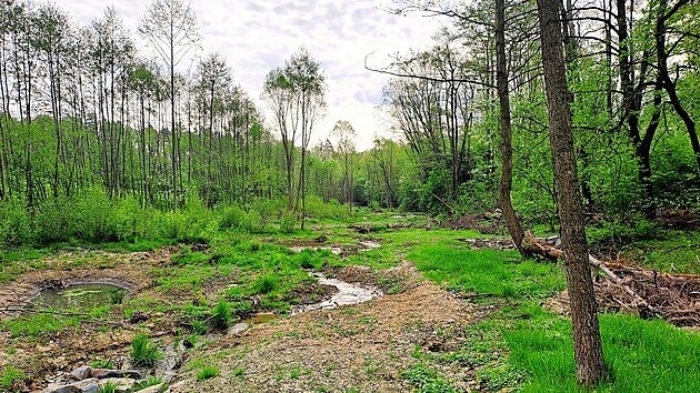 Meandrující koryta Hájnického potoka na Bruntálsku v Moravskoslezském kraji