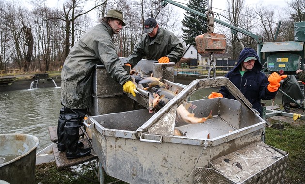 Jeřáb nakládá kapry do přistavených kádí, lidé vyčkávají v řadě u stánku s prodejem a tvoří se i fronta náklaďáků s bednami pro odvoz ryb na stánky. Tak to o víkendu v osm hodin ráno vypadalo u sádek v Jistebníku.