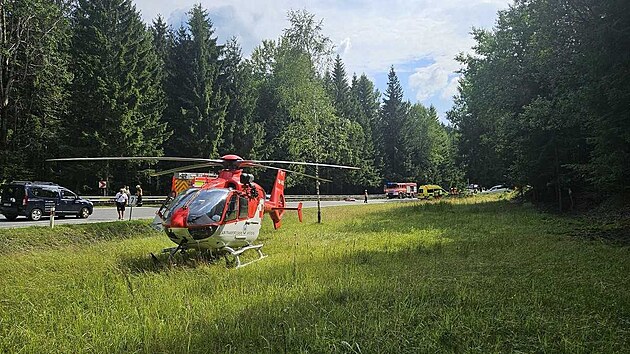 Záchranářský vrtulník při zásahu po nehodě dvou motorkářů na Bílé v Beskydech. Jednomu z nich už bohužel nebylo pomoci. (18. srpna 2023)