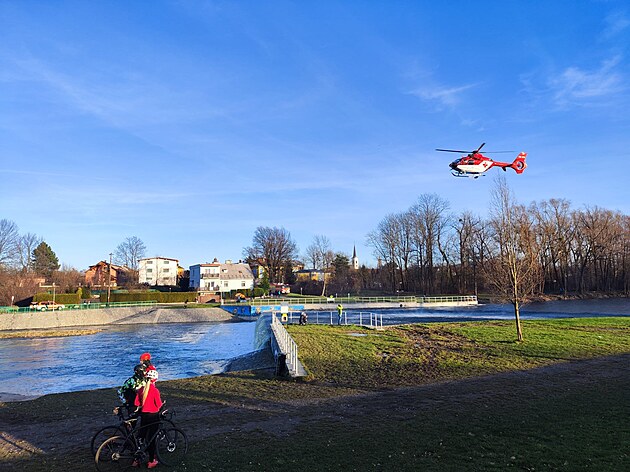 Záchranářský vrtulník nad řekou Ostravicí ve Frýdku-Místku, kde se topil muž ve středním věku. Zůstává v kritickém stavu v ostravské fakultní nemocnici. (28. prosince 2023)