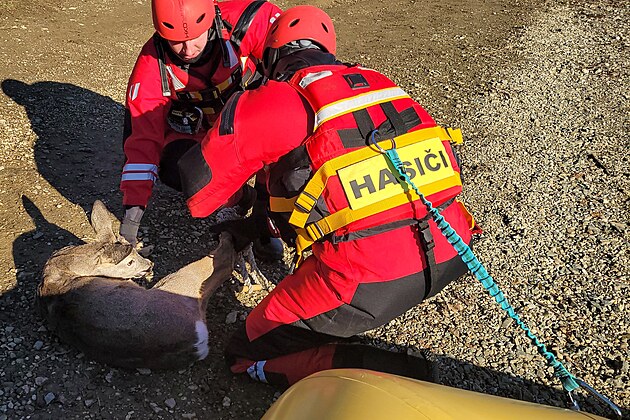 Srna uvázla na ledu, nemohla zpátky. Vysvobodili ji profesionální hasiči. (29. prosince 2024)