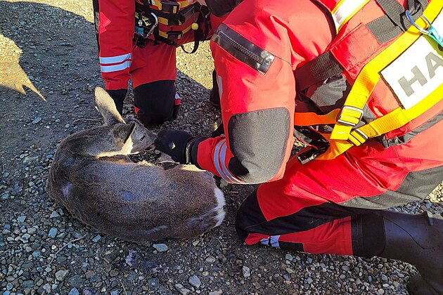 Srna uvázla na ledu, nemohla zpátky. Vysvobodili ji profesionální hasiči. (29. prosince 2024)