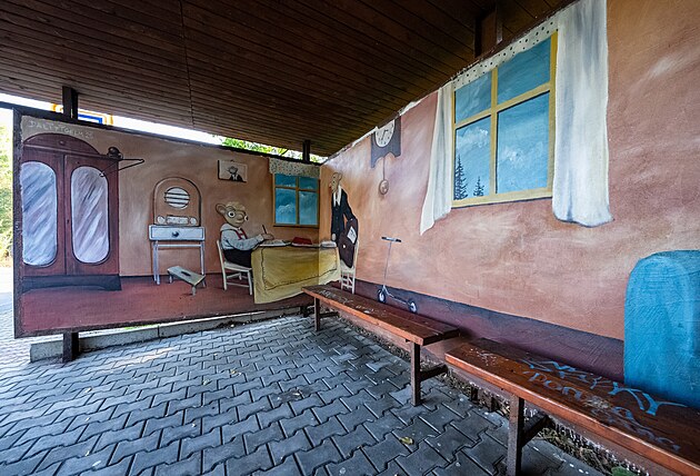Originálně ilustrovanou výzdobu má autobusová zastávka Josefa Skupy v Ostravě-Porubě. Postaral se o ni výtvarník Dalibor Figela, který místo proměnil v obývací pokoj oblíbených českých loutek Spejbla a Hurvínka. (9. října 2025)