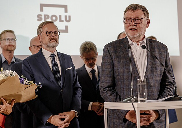 Tisková konference Spolu po skončení voleb do Sněmovny. Na snímku Petr Fiala a Zbyněk Stanjura (4. října 2025)