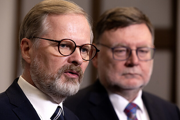Premiér Petr Fiala a ministr financí Zbyněk Stanjura po jednání na Pražském hradě s prezidentem republiky Petrem Pavlem. (9. prosince 2024)