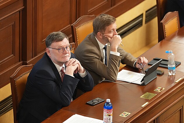 Ministr financí Zbyněk Stanjura a ministr vnitra Vít Rakušan před hlasováním o nedůvěře vládě (17. června 2025)
