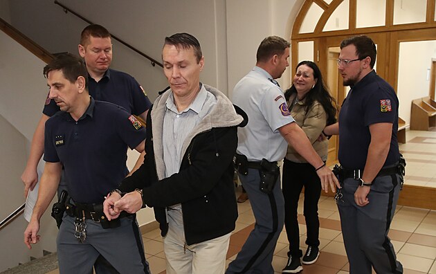 Obžalovaného Romana Salakvardu vedou do soudní síně, za noční žhářský útok na auta a dům karvinské úřednice dostal jedenáct let vězení. (20. ledna 2025)