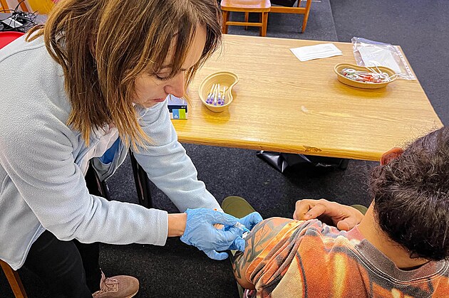 Očkování lidí z Hulvácké ulice v ostravském obvodu Jih. V lokalitě řádí nákaza žloutenky typu A. (16. ledna 2025)