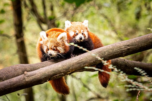 Mláďata pandy červené z ostravské zoologické zahrady už dělají návštěvníkům radost svým venkovním pobytem. (9. října 2024)