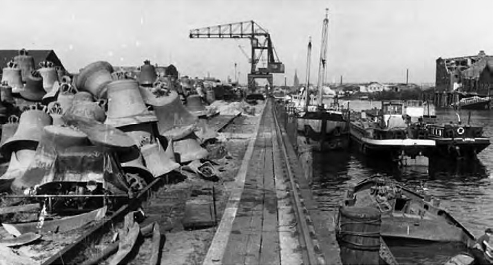 Dobová fotografie takzvaného hřbitova zabavených zvonů, které nacisté převáželi z celé Evropy do německého přístavu Hamburk.