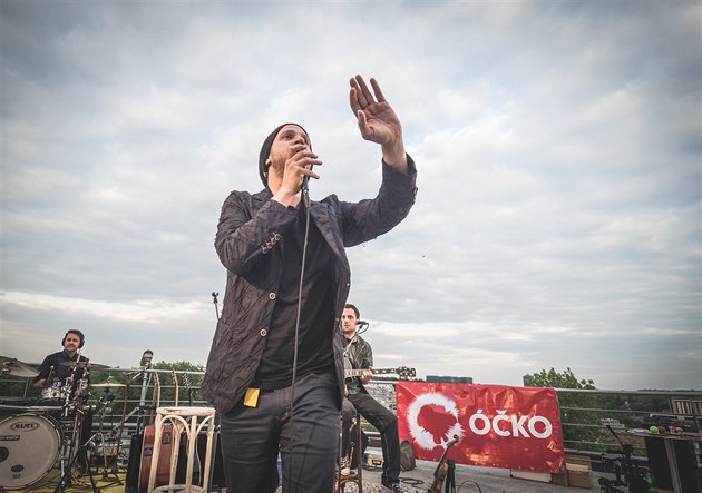 Tomáš Polák z kapely O5&Radeček. Skupina zahrála na terase Národního památníku na Vítkově.