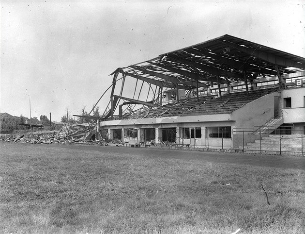Původní tribuna Androva stadionu v Olomouci v roce 1945 poničená výbuchem. Do vzduchu ji vyhodili při květnových bojích ustupující němečtí vojáci.