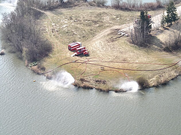 U Hustopečí nad Bečvou bojují hasiči se zesilující kontaminací vodní nádrže benzenem i speciálním zařízením, pomocí něhož stříkají nad hladinu vodu, aby se zrychlila oxidace chemikálie. (28. března 2025)
