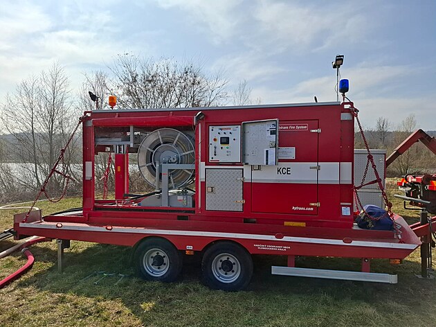 U Hustopečí nad Bečvou bojují hasiči se zesilující kontaminací vodní nádrže benzenem i speciálním zařízením, pomocí něhož stříkají nad hladinu vodu, aby se zrychlila oxidace chemikálie. Součástí je velkokapacitní čerpadlo. (28. března 2025)