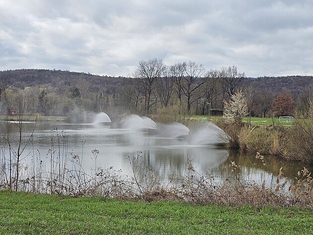 U Hustopečí nad Bečvou bojují hasiči se zesilující kontaminací vodní nádrže benzenem i speciálním zařízením, pomocí něhož stříkají nad hladinu vodu, aby se zrychlila oxidace chemikálie. (31. března 2025)