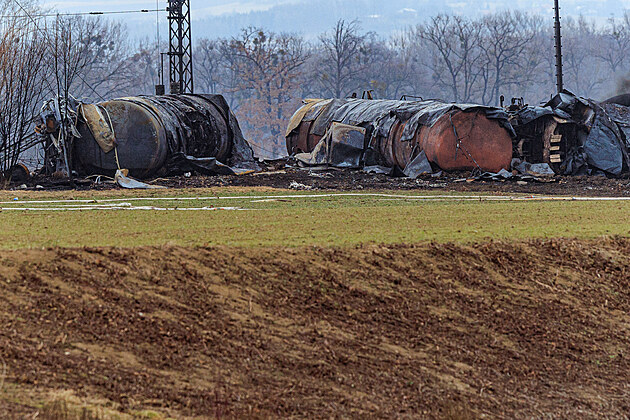 Hasiči přečerpávají chemikálii z poškozených vagónů po požáru vykolejeného cisternového vlaku převážejícího vysoce toxický benzen. Na místě stále likvidují i další následky nehody. (1. března 2025)