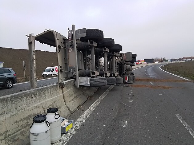 Nákladní vůz převážející štěrk narazil do svodidel a poté se přes ně převrátil do protisměru, kde do něj narazilo osobní auto. Jeho řidič na místě zemřel.