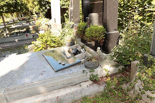 Poškozený hrob na hřbitově v Olomouci Neředíně