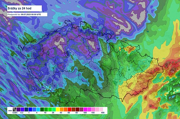 Mapa odhadovaného úhrnu srážek. (7.7.2025)