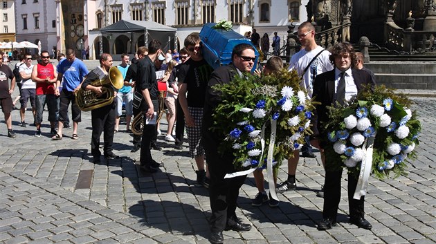 Na "pohřbu" nechyběly ani dva smuteční věnce, z nichž jeden nesl na stuhách nápis "Vzpomínáme, fanoušci olomoucké kopané", či smuteční dechovka.