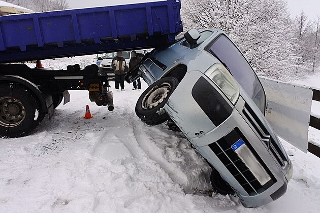 Řidič s nákladním vozem při couvání na namrzlé silnici uklouzl a korbou narazil do zaparkovaného auta. To zůstalo napůl převrácené.