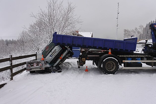 Řidič s nákladním vozem při couvání na namrzlé silnici uklouzl a korbou narazil do zaparkovaného auta. To zůstalo napůl převrácené.