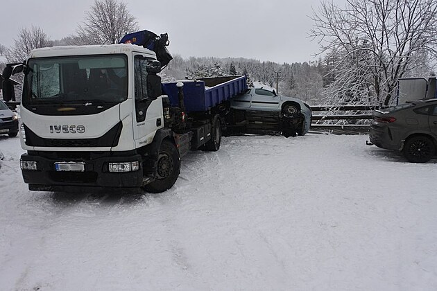 Řidič s nákladním vozem při couvání na namrzlé silnici uklouzl a korbou narazil do zaparkovaného auta. To zůstalo napůl převrácené.