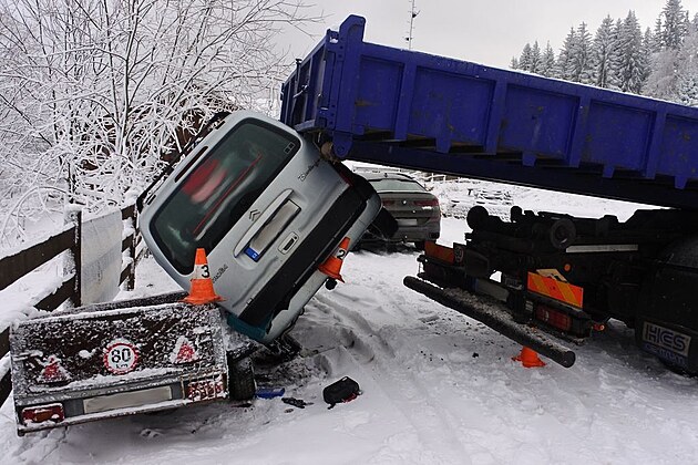 Řidič s nákladním vozem při couvání na namrzlé silnici uklouzl a korbou narazil do zaparkovaného auta. To zůstalo napůl převrácené.