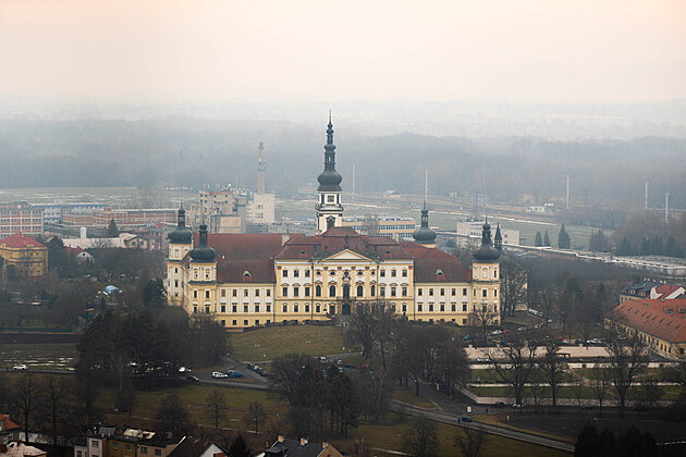 Při pohledu z jižní věže katedrály sv. Václava na sever nelze přehlédnout Klášterní Hradisko. Jde o bývalý bendiktýnský a poté premonstrátský barokní klášter, ze kterého se následně během napoleonských válek stala vojenská nemocnice, která zde zůstává dodnes. (28. ledna 2026)