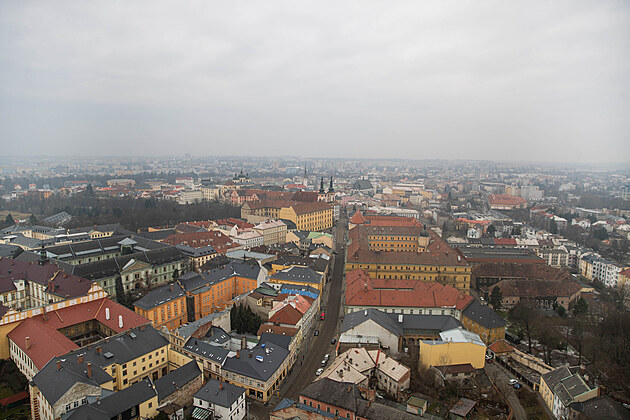 Při pohledu z jižní věže katedrály sv. Václava západní pohled nabízí úžasné panorama Olomouce. Z toho vyvstávají takřka v každém směru další církevní budovy. Na snímku jde vidět dvojvěží kostela Panny Marie Sněžné a za ním kostel sv. Mořice. Ten byl od středověku hlavním městským chrámem, neboť katedrála sloužila primárně arcibiskupství. (28. ledna 2026)