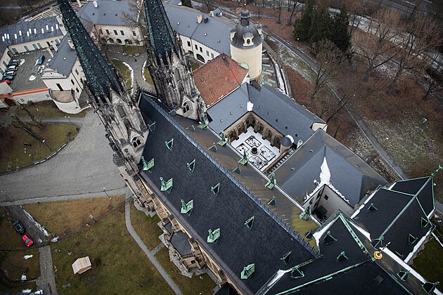 Z jižní věže je krásně vidět celý Zdíkův palác, původně zvaný jako Přemyslovský. Románský komplex ukrývá například rajský dvůr se studnou, kapli sv. Jana Křitele a další budovy arcibiskupského paláce. (28. ledna 2026)