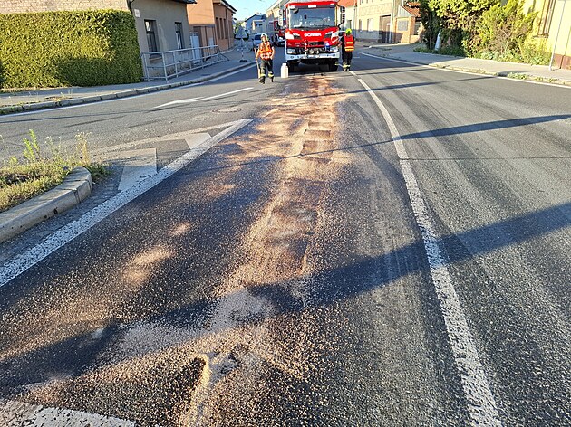 Olej unikající z projíždějící cisterny likvidovali hasiči v Olomouci. (2. července 2025)