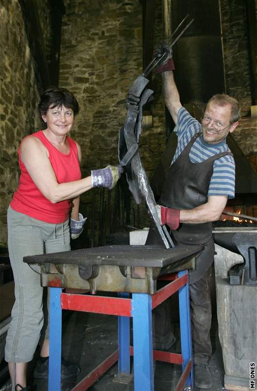Na helfštýnském Hefaistonu ukazuje své dovednosti i umělecký kovář Poldi Habermann z Jihlavy i se svou manželkou.