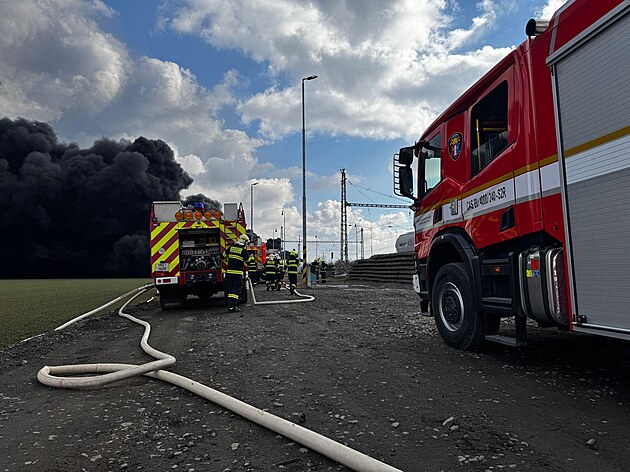 Hasiči zasahují v Hustopečích nad Bečvou na Přerovsku, kde z poškozené železniční cisterny na nákladním vlaku uniká benzen a hoří.