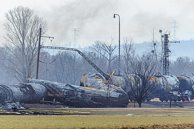 Hasiči přečerpávají chemikálii z poškozených vagónů po požáru vykolejeného cisternového vlaku převážejícího vysoce toxický benzen. Na místě stále likvidují i další následky nehody. (1. března 2025)