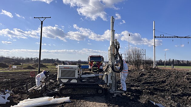 Pracovníci společnosti Dekonta na místě zatloukají larsenovou stěnu do osmimetrové hloubky, hotových je zatím zhruba třicet metrů délky. (19. března 2025)
