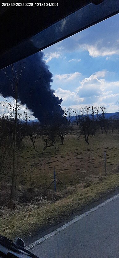 Hasiči zasahují v Hustopečích nad Bečvou na Přerovsku, kde z poškozené železniční cisterny na nákladním vlaku uniká benzol a hoří.