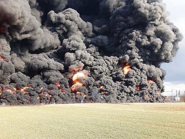 Hasiči zasahují v Hustopečích nad Bečvou na Přerovsku, kde z poškozené železniční cisterny na nákladním vlaku uniká benzol a hoří.